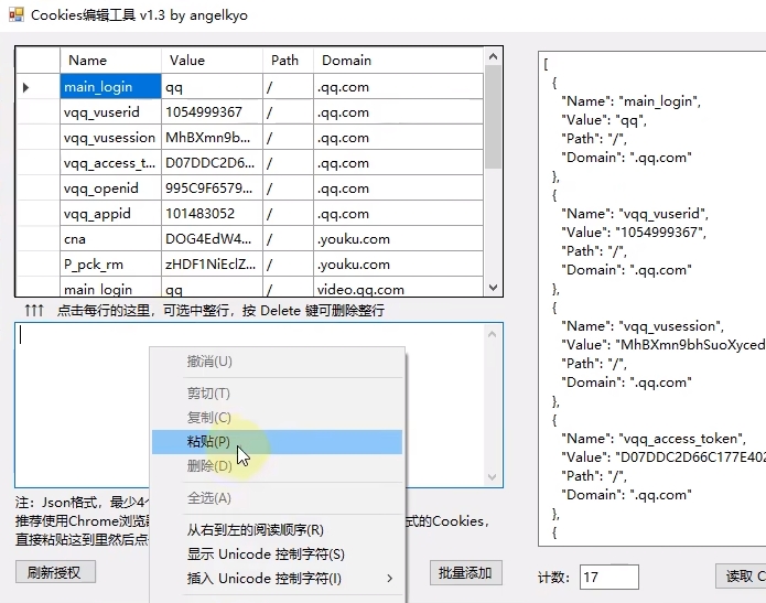 接下里打开cookies编辑工具,把刚刚复制的cookie值粘贴进去
